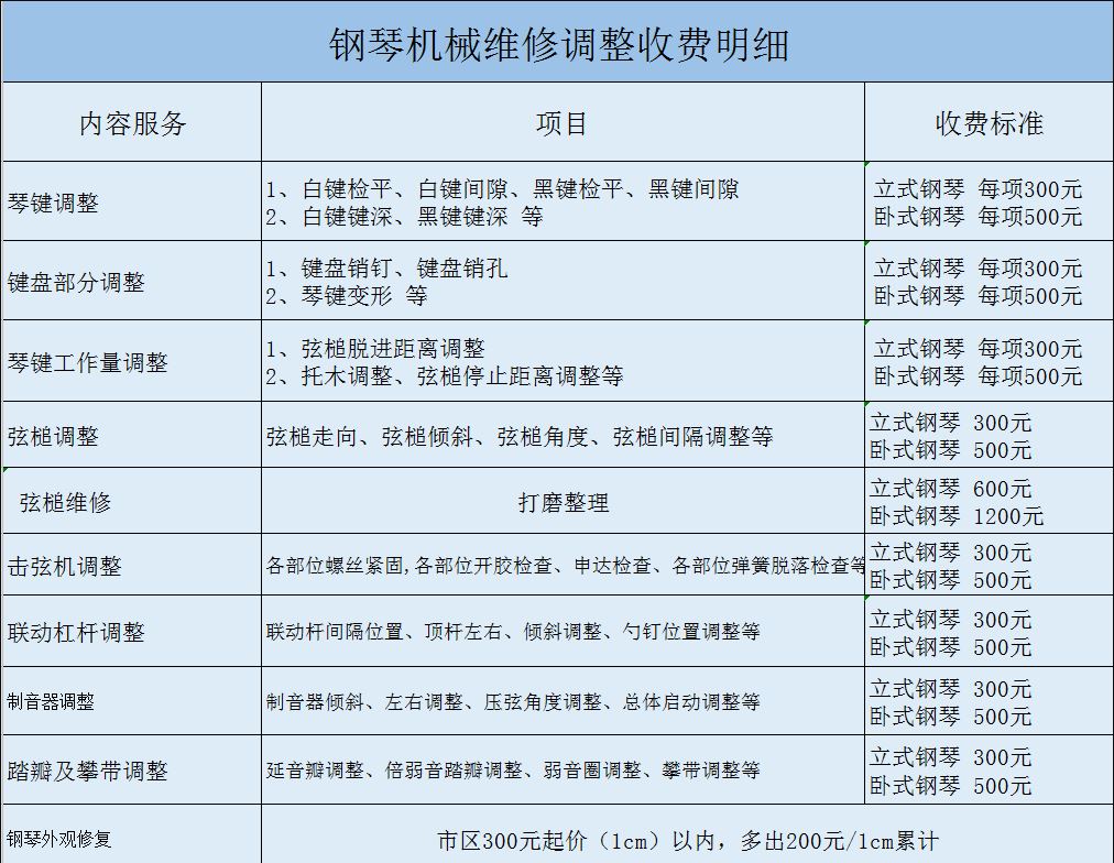 闸北钢琴维修价格一览表: